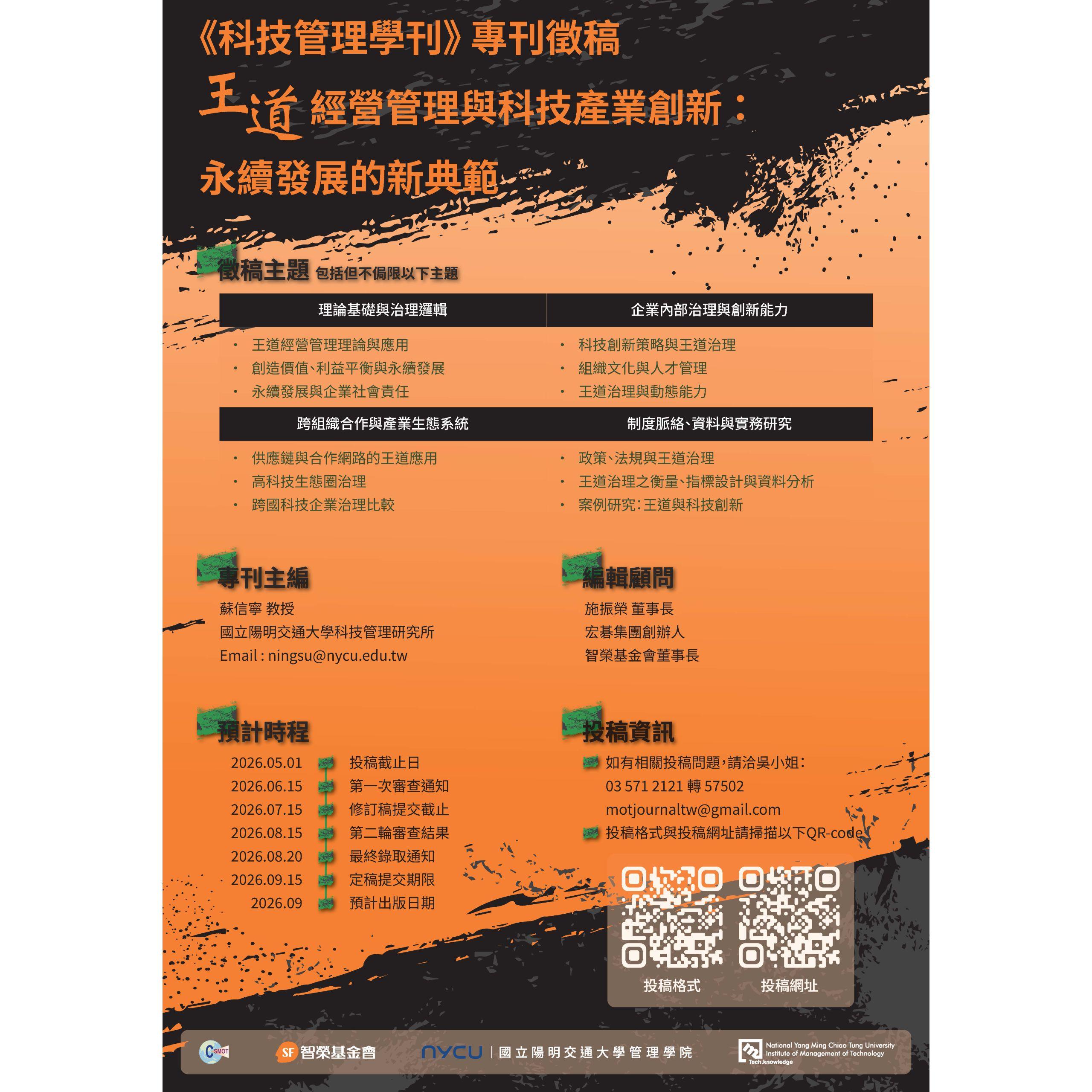 科技管理學刊 「王道經營管理與科技產業創新:永續發展的新典範」 專刊徵稿啟事 Special issue: “Wangdao Management and Innovation in the Technology Industry: A New Paradigm for Sustainable Development”